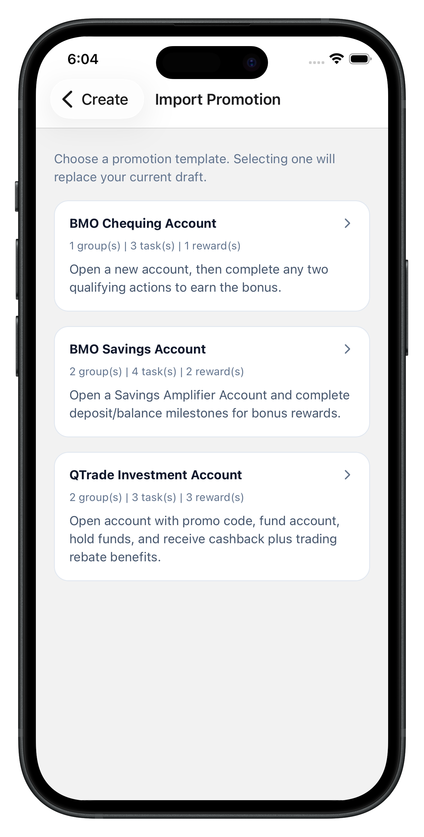 Import card promotions instantly using pre-built templates — just enter your dates and start tracking.