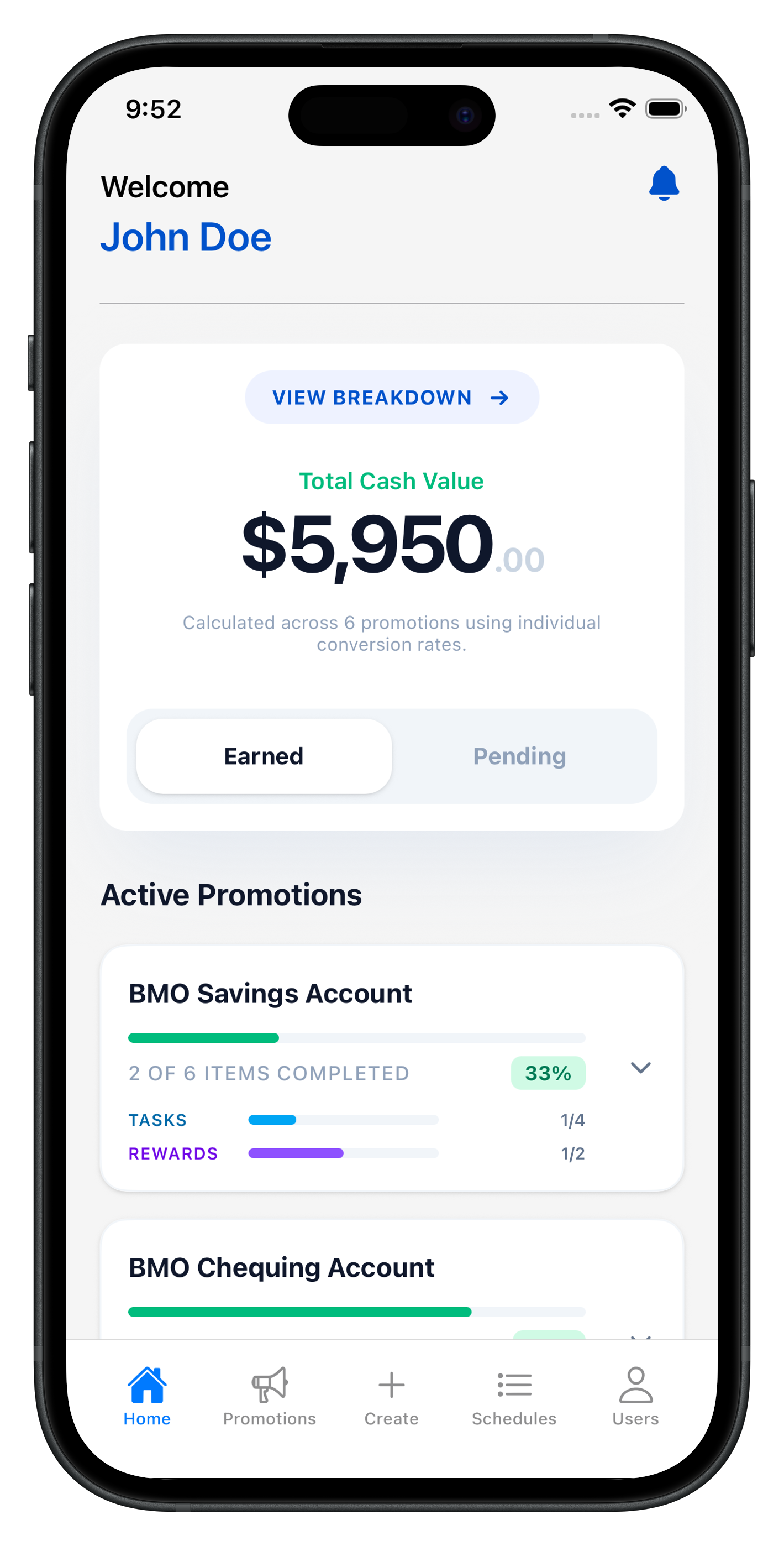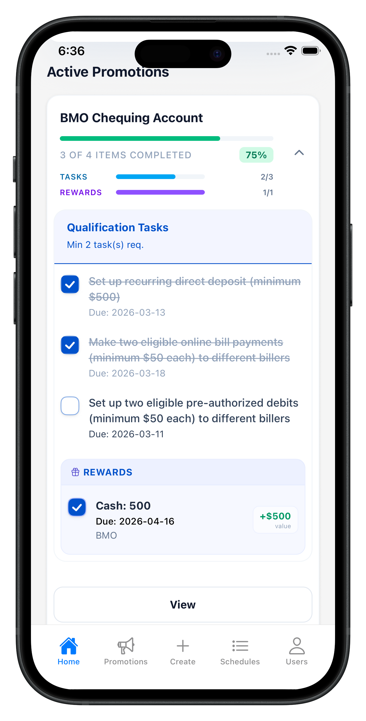 Add reward promotions once and let the app track deadlines, tasks, and payout dates for you.